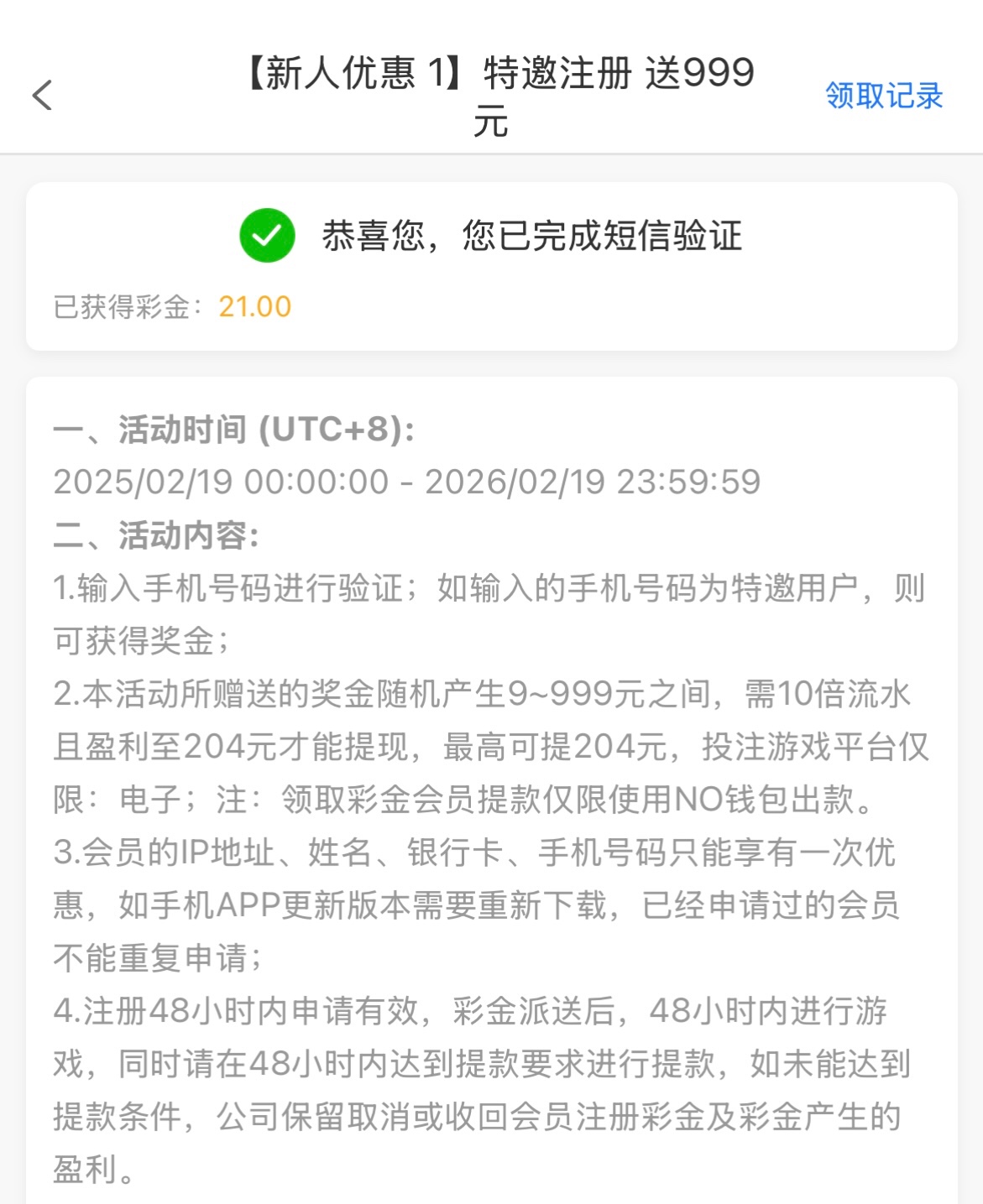 特邀碰瓷:收到短信上号注册自助验证手机号领取到了21,有短信老哥自己去试试