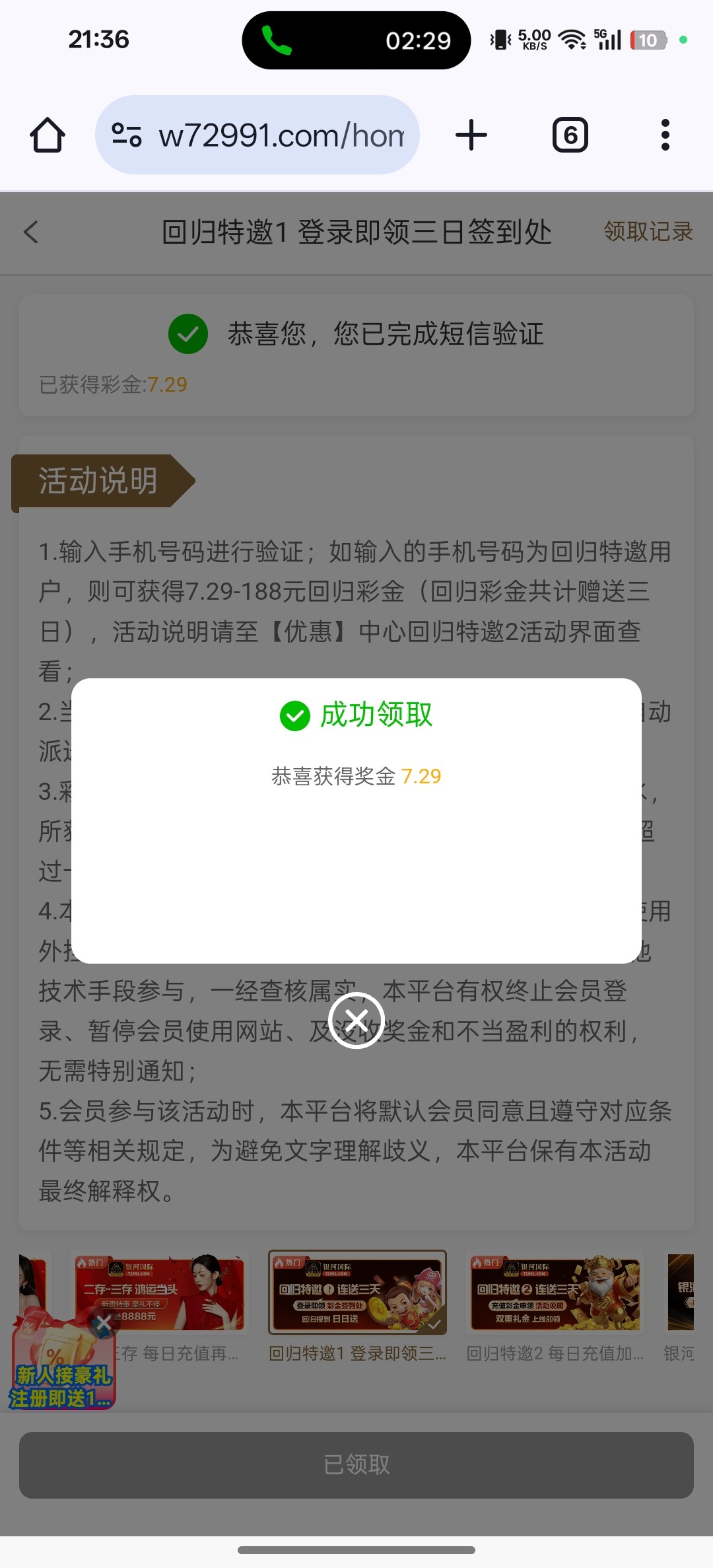银河国际回归特邀送7.29刚刚接到电话之前领不了现在3个手机号都可以领了,之前不能领的去试试