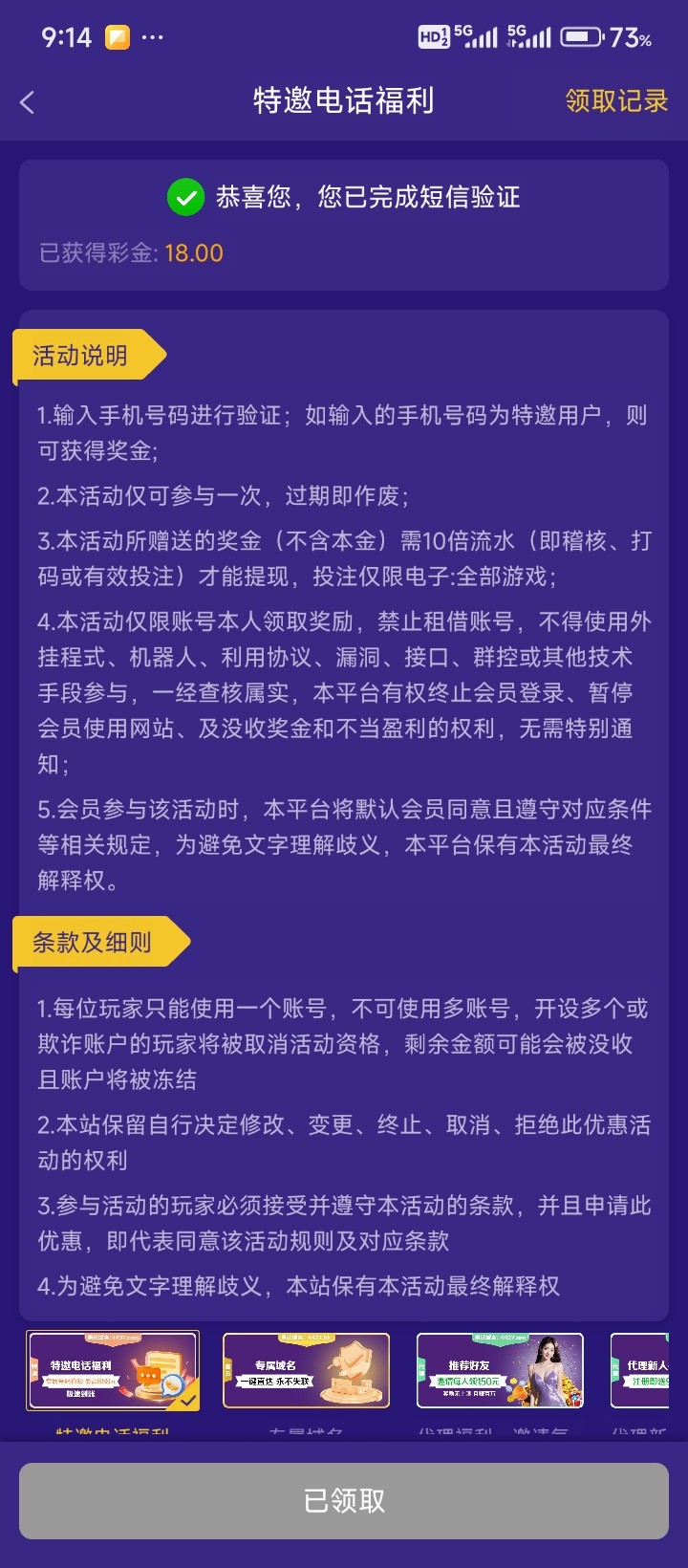 很早就领过了,而且还领过电话回访的