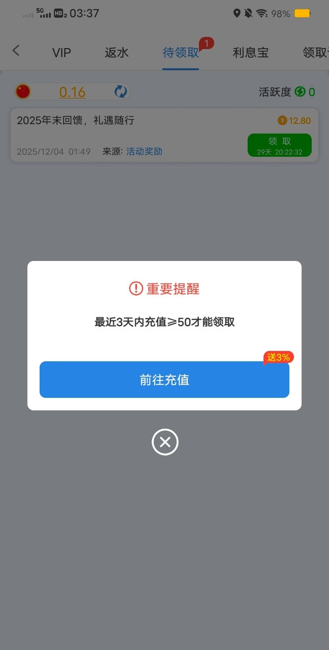262.com 上号看见能领12块8彩金,但是要最近三天有充值≥50元以上的可以去看看,我262没赢过,不会充了(严禁充值!)