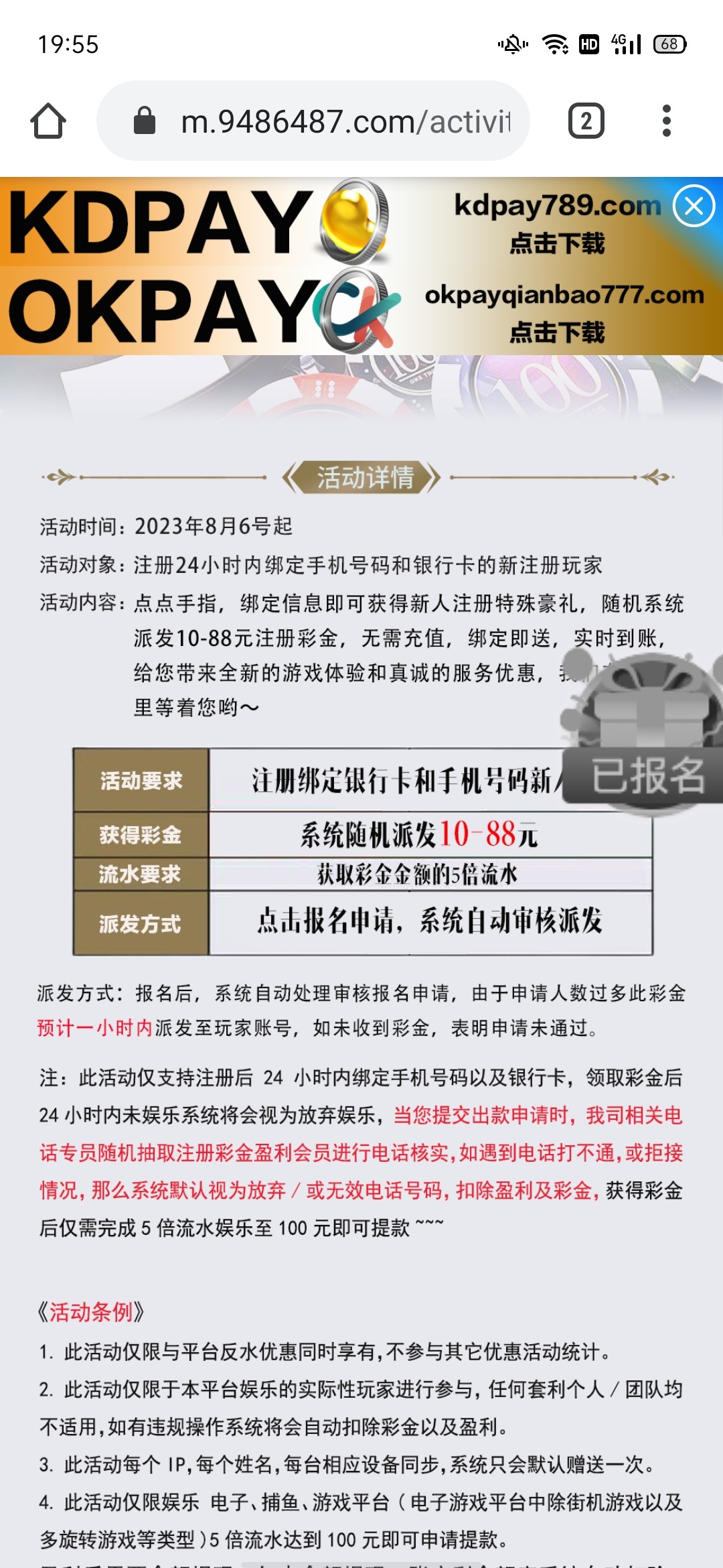 注册绑卡优惠里秒领88彩金,五倍水,满100提。