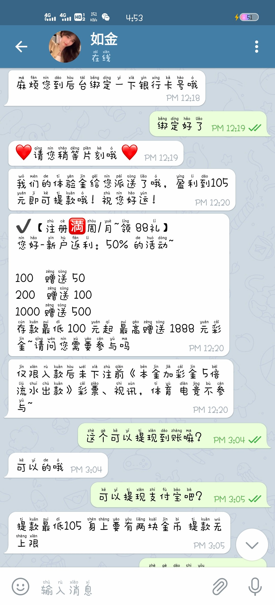 注册绑卡找在线客服申请注册体验金,我6块钱上200+可惜只能提105。去玩那个海王捕鱼开0.03那种大鱼刚出来直接锁,赢了就慢慢加,希望给我老哥出款给个茶水,祝各位老哥天天鸿运当头。