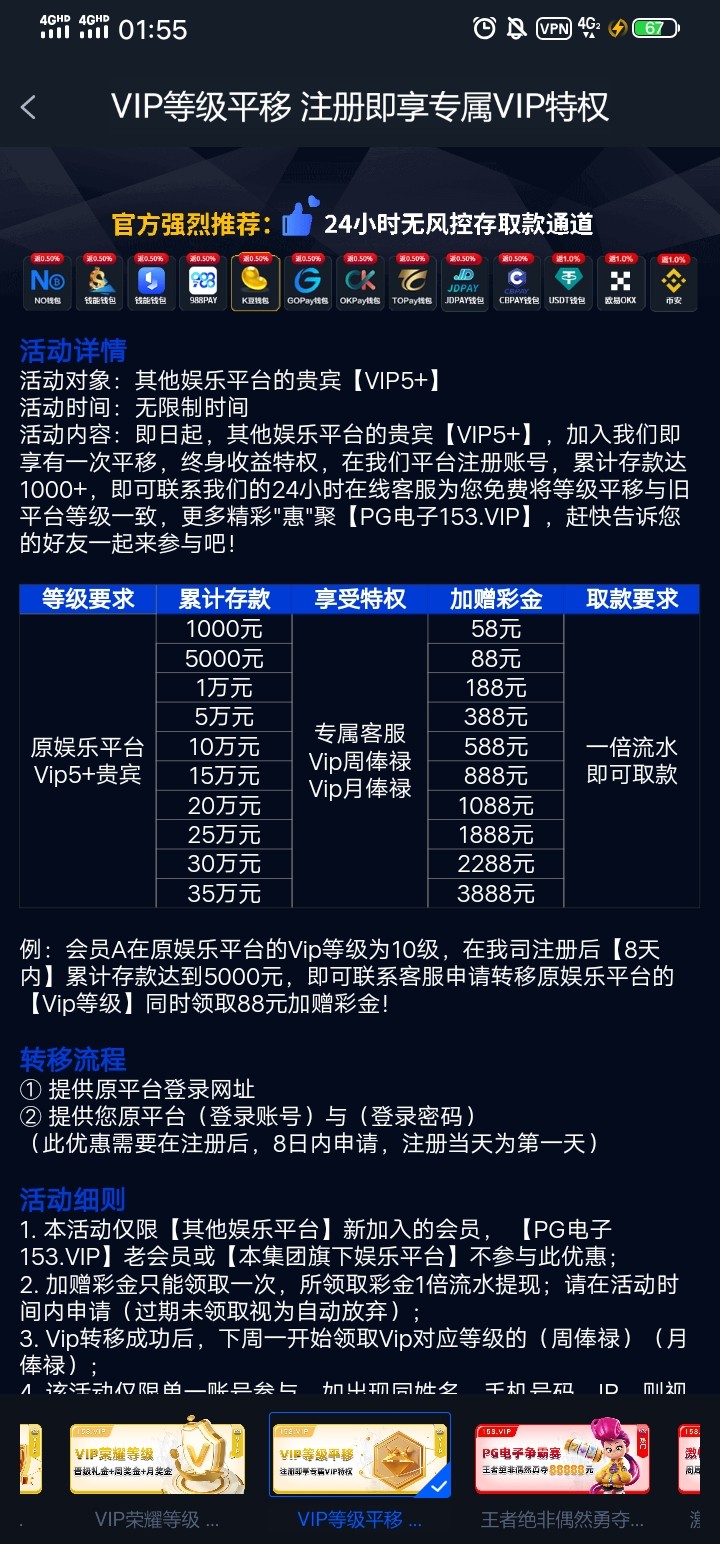 这个建议vip等级比较高的老哥去看看 这个我了解了一下就是假如vip10每个月只需要充值和投注1块钱就可以领取俸禄相当于不用打保级流水 等级特别高的老哥可以转移 两天过后再把账号登录回来改密码 但是需要7天累计充值1千才能转移 有需要的老哥可以去